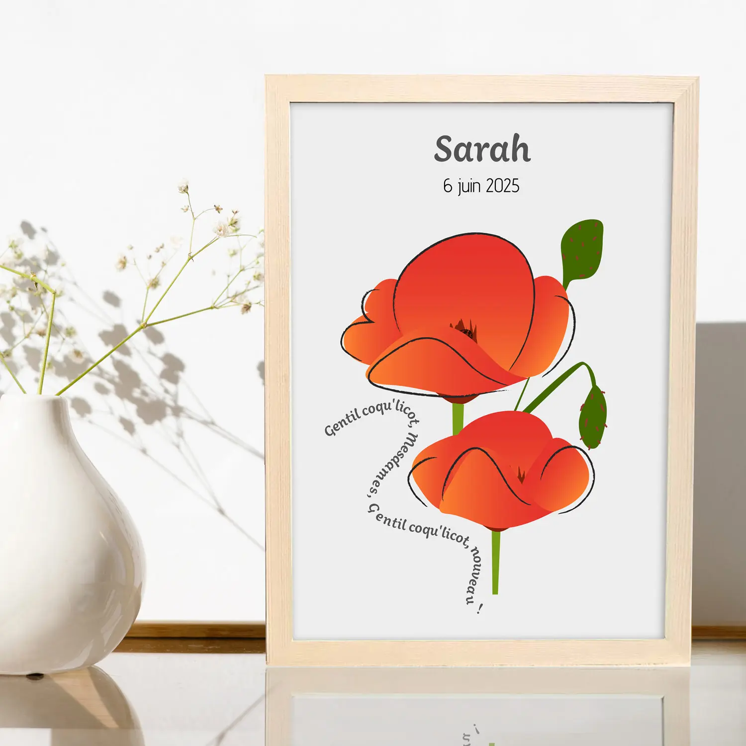 Une affiche poétique et tendre autour de la célèbre comptine “Gentil coquelicot mesdames”, réinterprétée avec douceur pour décorer la chambre de bébé.