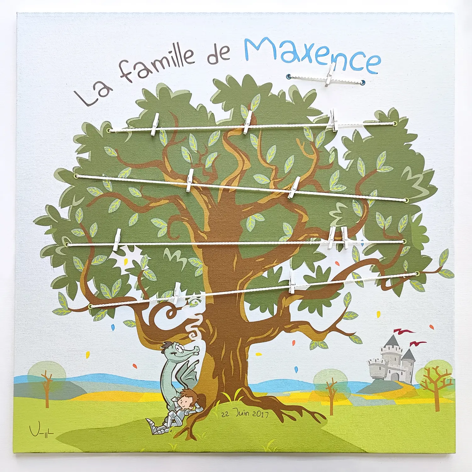 Découvrez cet arbre généalogique unique sur le thème chevaliers et dragons, spécialement conçu pour les enfants. Avec son chevalier et son dragon dessiné exclusivement pour nous par un illustrateur de la métropole lilloise, il apporte une touche ludique et authentique à la découverte de la famille.