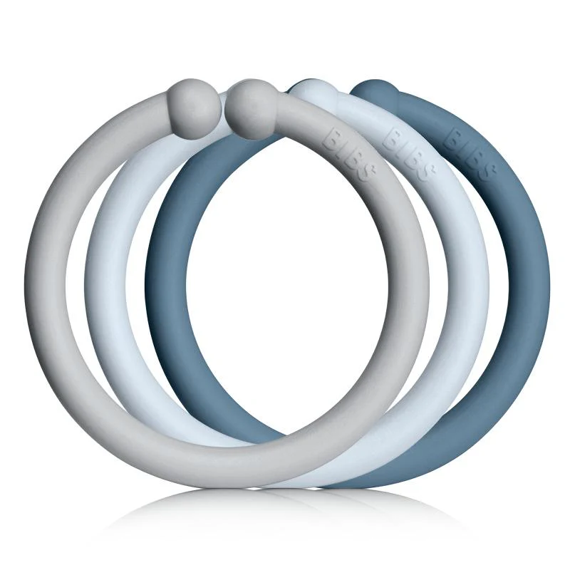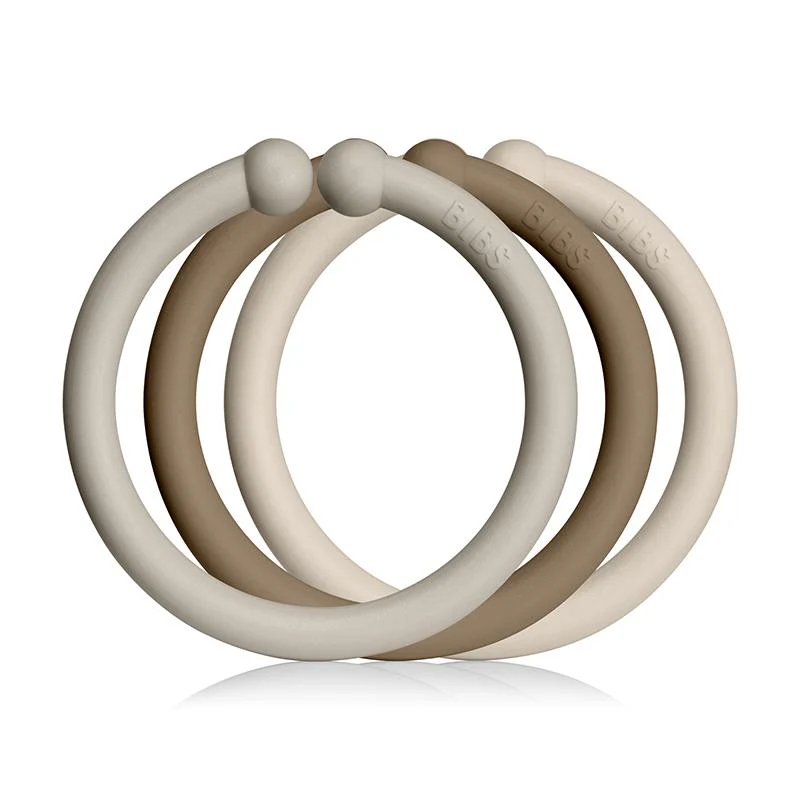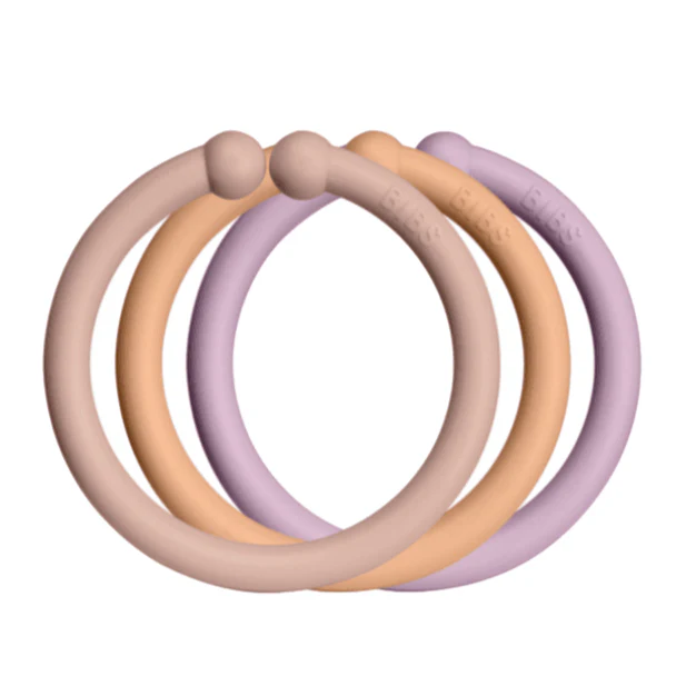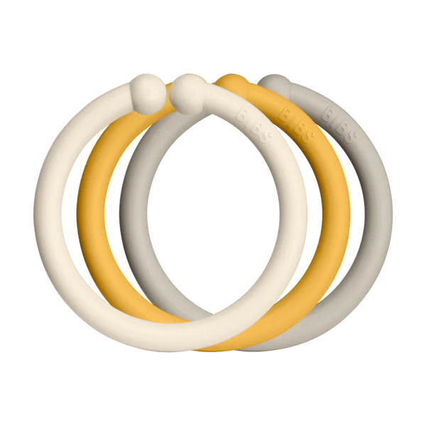 Les anneaux de couleurs Bibs peuvent être utilisés sur un landau, une poussette, un siège d’auto ou simplement pour jouer.