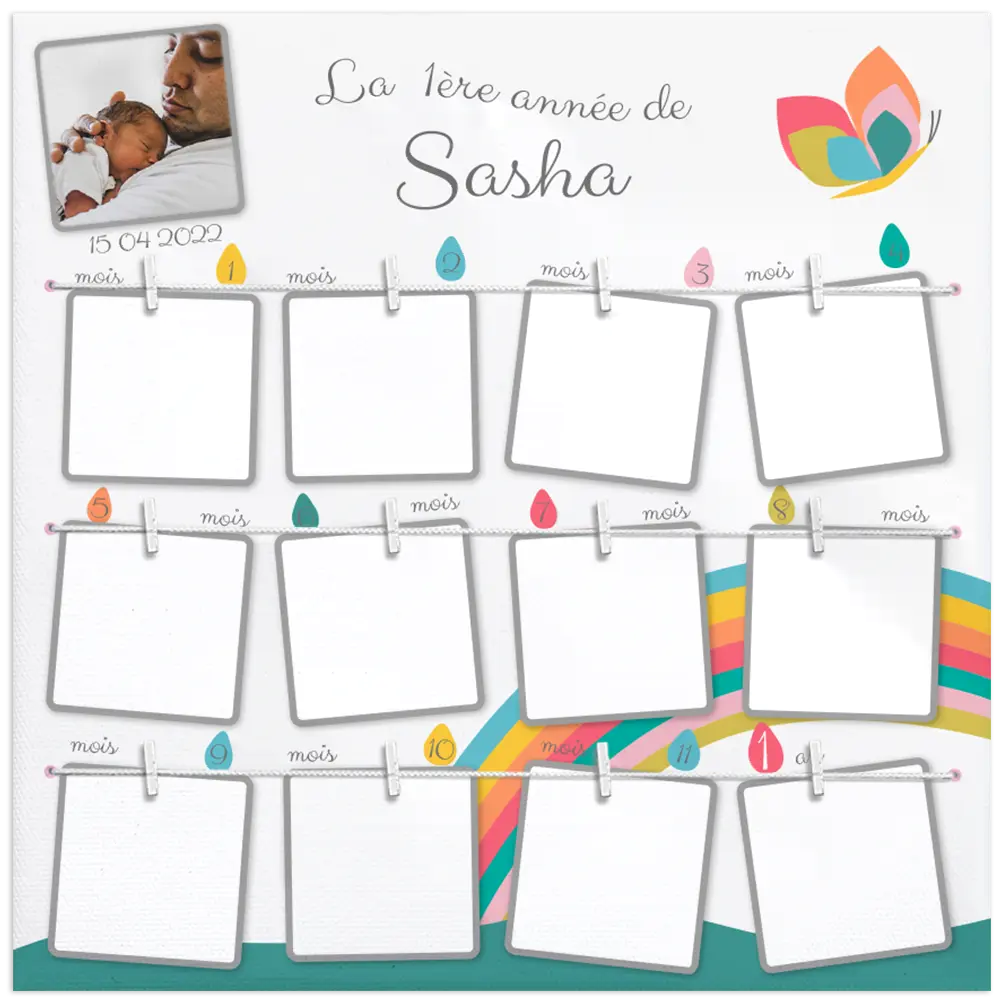 - le prénom de votre enfant, aucune photo imprimée sur la toile et 13 mini-pinces pour suspendre les photos de votre bébé de sa naissance à son premier anniversaire,