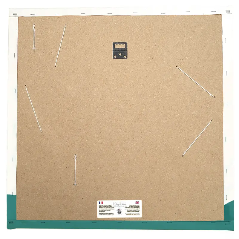 - Toile de qualité allemande 350g/m2, imprimée en 11 couleurs (haute qualité photo) avec encres pigmentaires à l’eau, sans acide ni solvant, collée et agrafée sur le cadre bois.