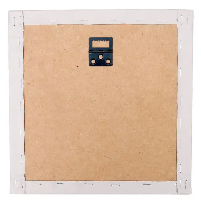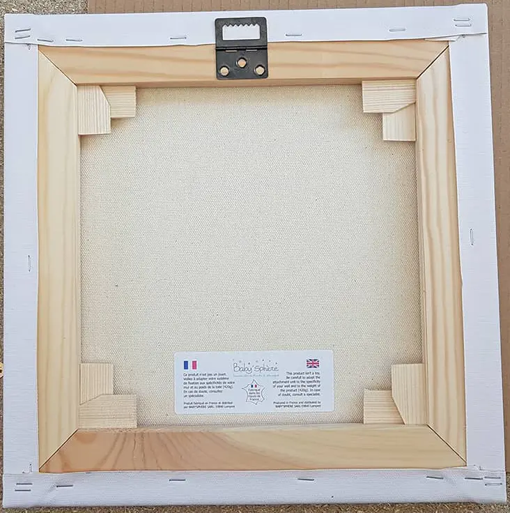 - Cadre de 22,2×22,2cm : Toile canvas contrecollée et agrafée sur médium d’1 cm d’épaisseur avec bords biseautés et système d’attache serti dans le bois