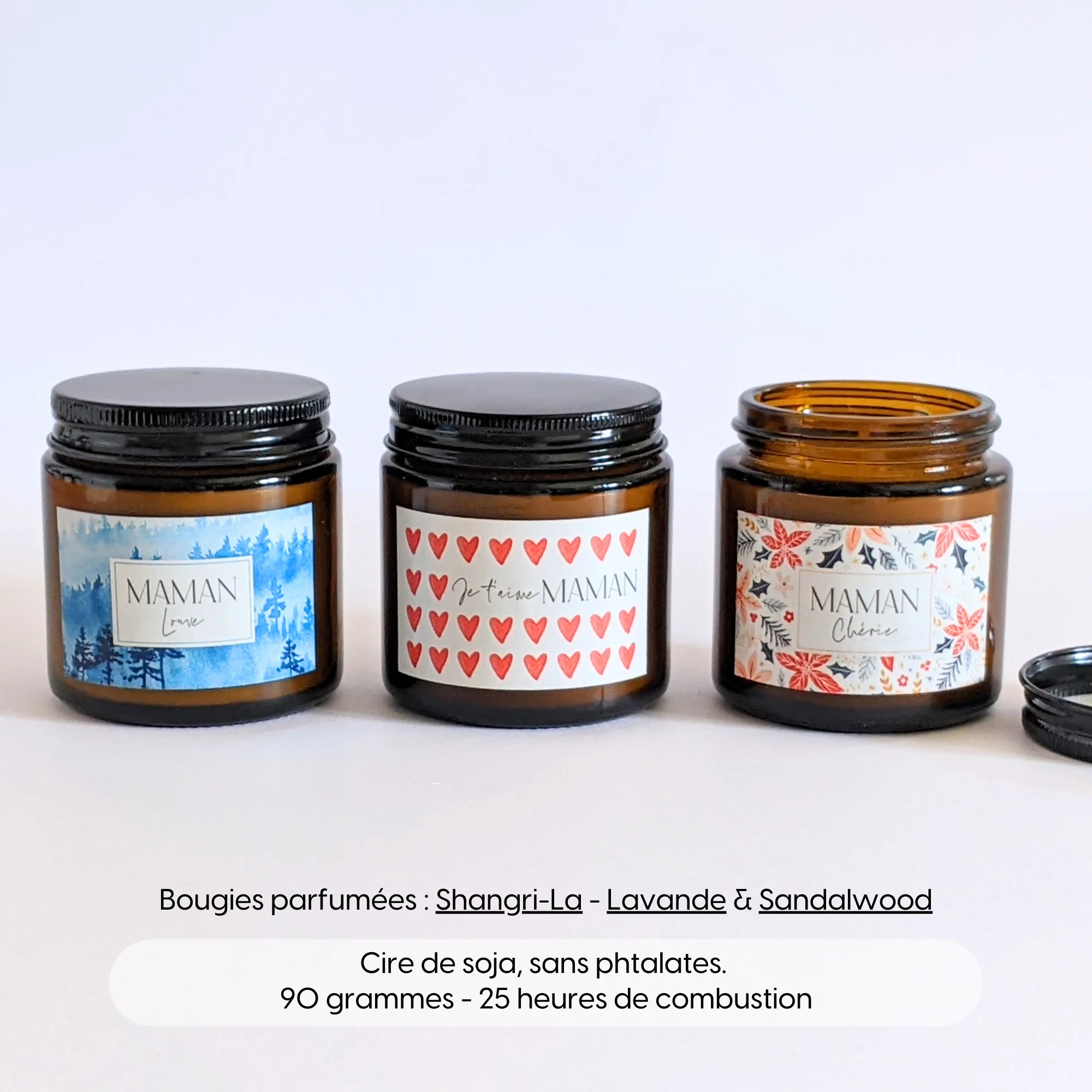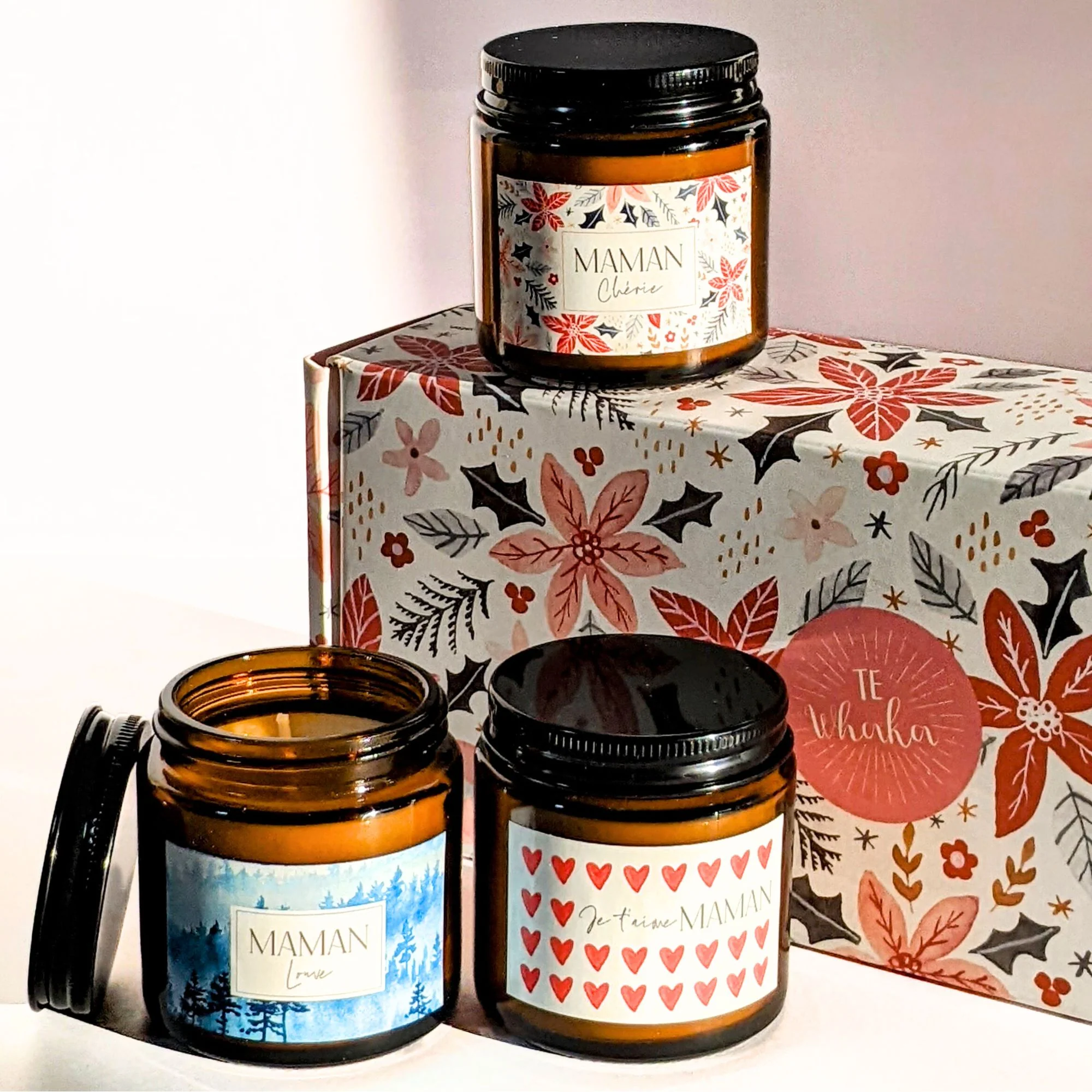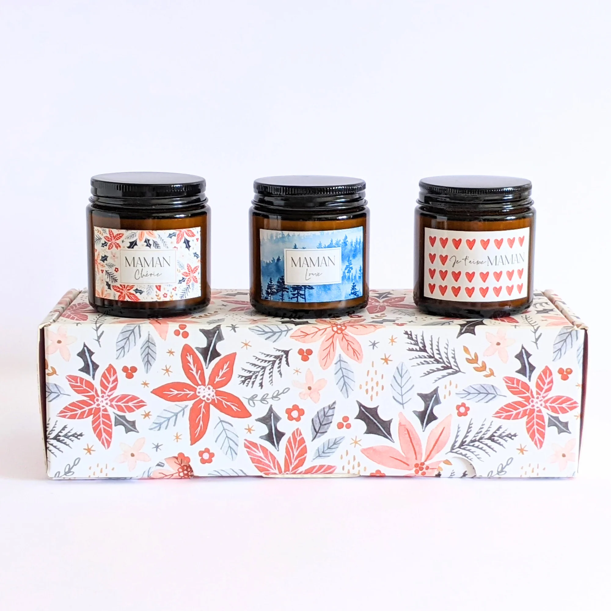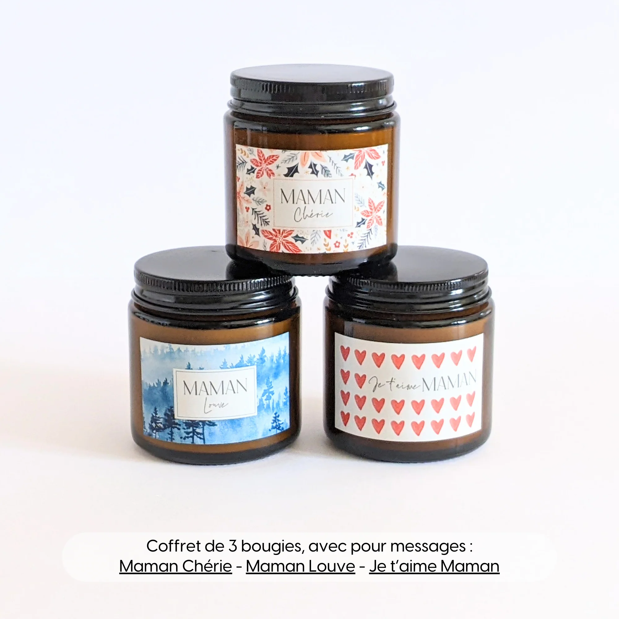Coffret cadeau fête des mères | 3 bougies parfumées Maman chérie – Maman Louve – Je t’aime maman