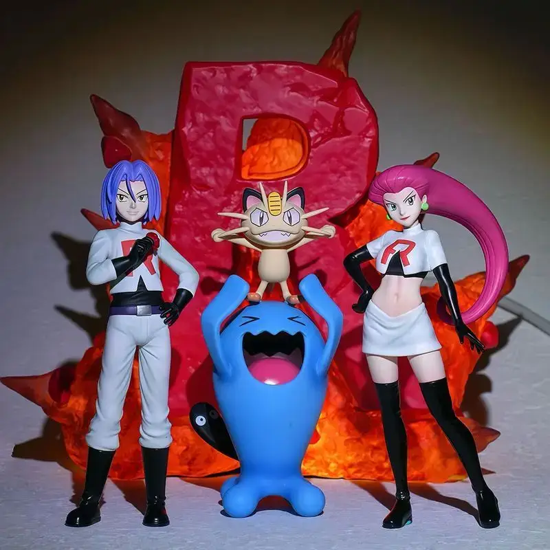 Décoration 4 Figurines Pokémon Team Rocket – Jessie, James, Miaouss & Qulbutoké avec fond d’explosion