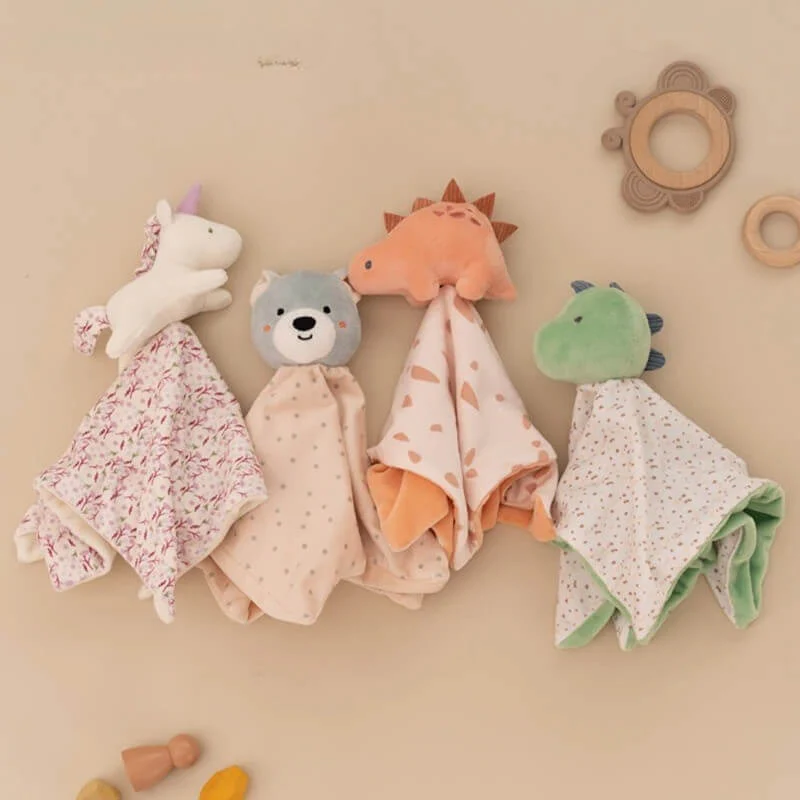 Chaque enfant est unique, et son doudou devrait l’être aussi! Avez-vous remarqué comment certains bébés s’attachent instantanément à un animal en particulier? Nos quatre modèles répondent à toutes les préférences: l’ours pour les amoureux des classiques, la licorne pour les rêveurs, le stégosaure et le T-Rex pour les petits explorateurs fascinés par les dinosaures. Le design façon dessin animé, avec ses couleurs vives et ses traits sympathiques, captive immédiatement l’attention des tout-petits.