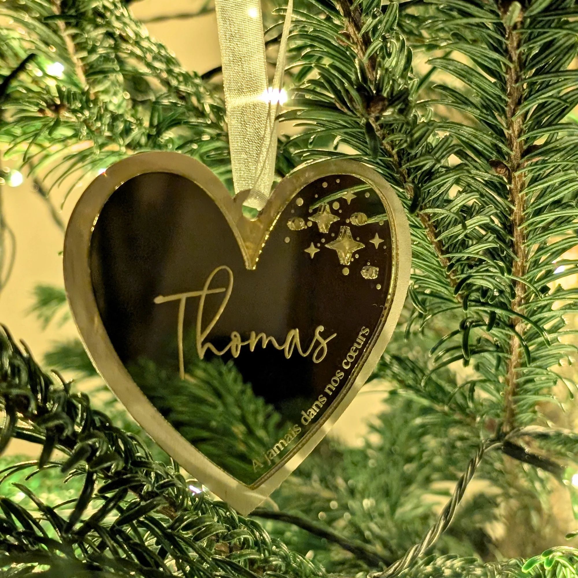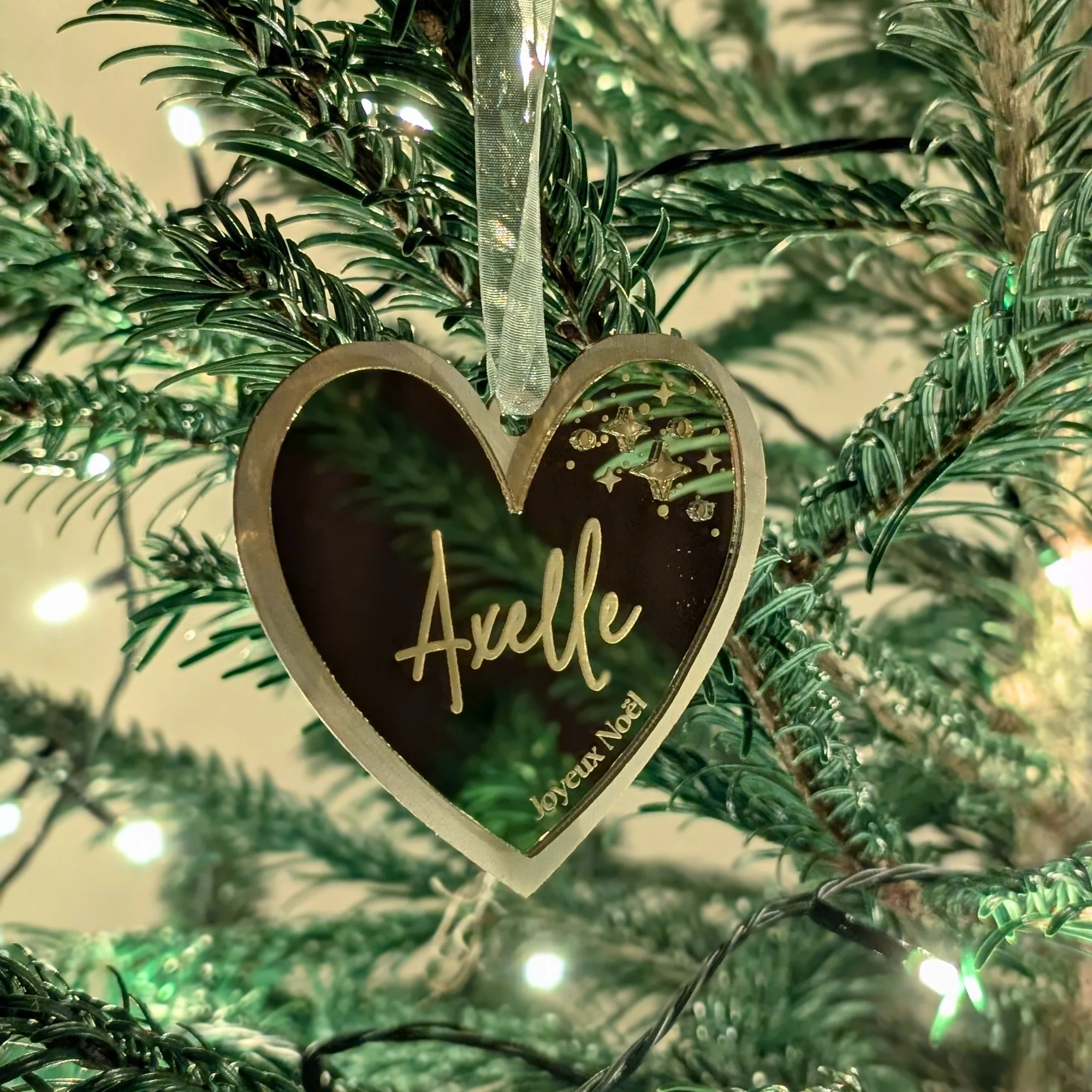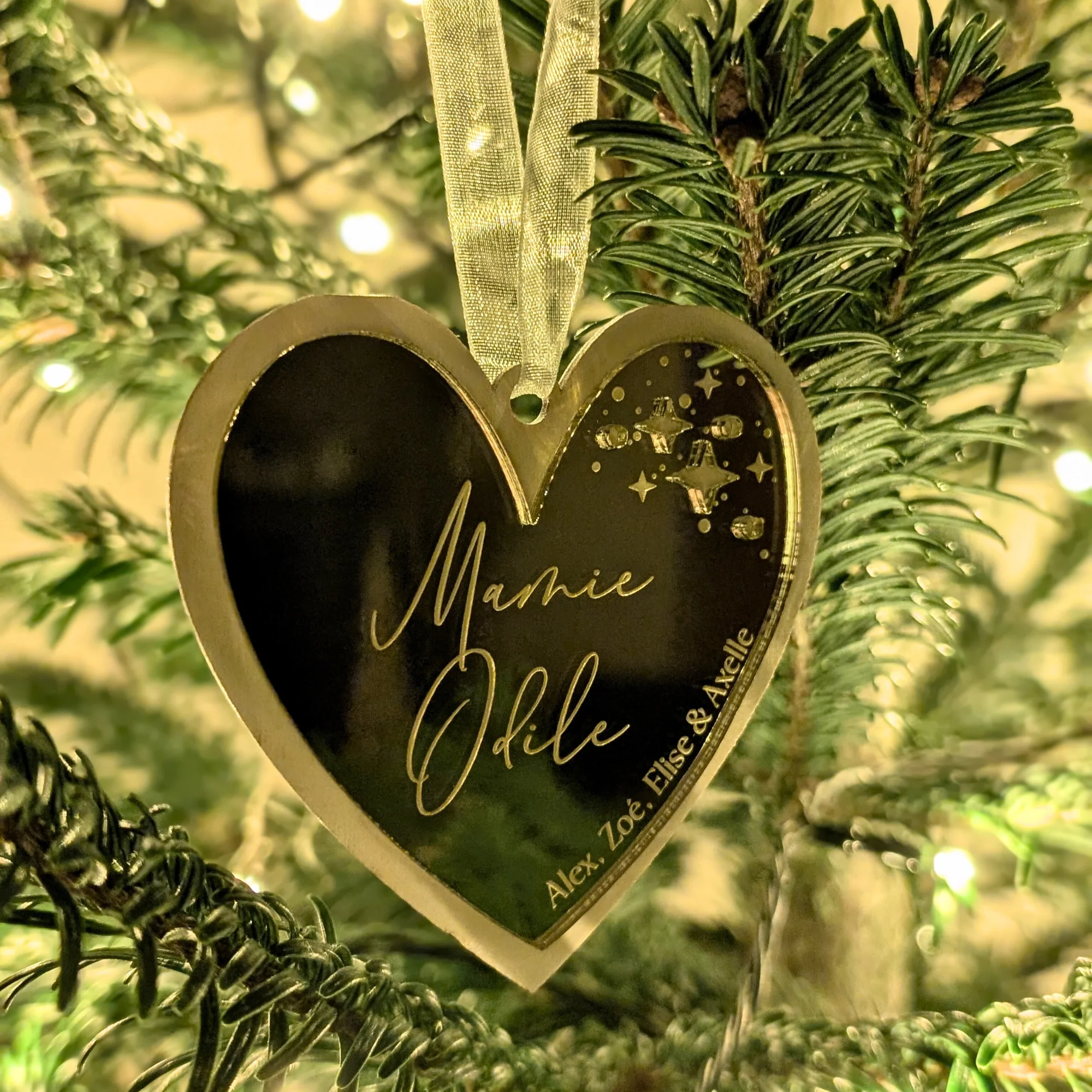 Boule de Noël bi-matière, réalisée en plexiglass doré et en bois, par un jeu de gravure et de découpe laser, personnalisez une boule de Noël. Choisissez la typographie souhaitée, et le texte au milieu + sur le bas du coeur : Joyeux Noël Maman + les prénoms des enfants, par exemple (ou autres variantes).