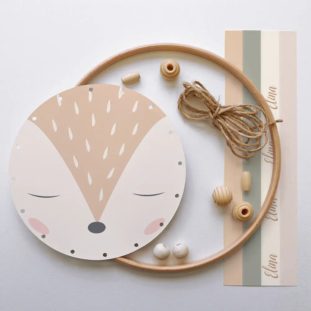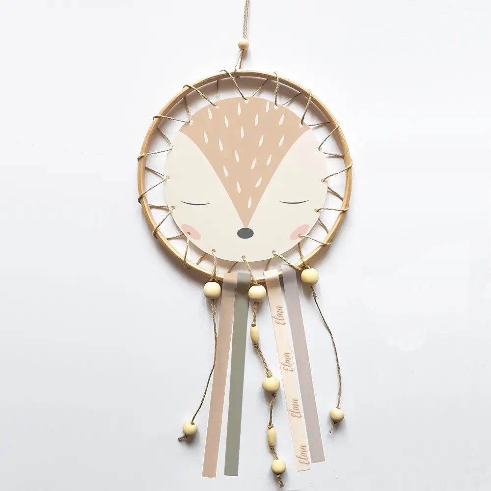 Le capteur de rêves biche est personnalisable au prénom de votre enfant, inscrit sur l’une des lanières du bas.