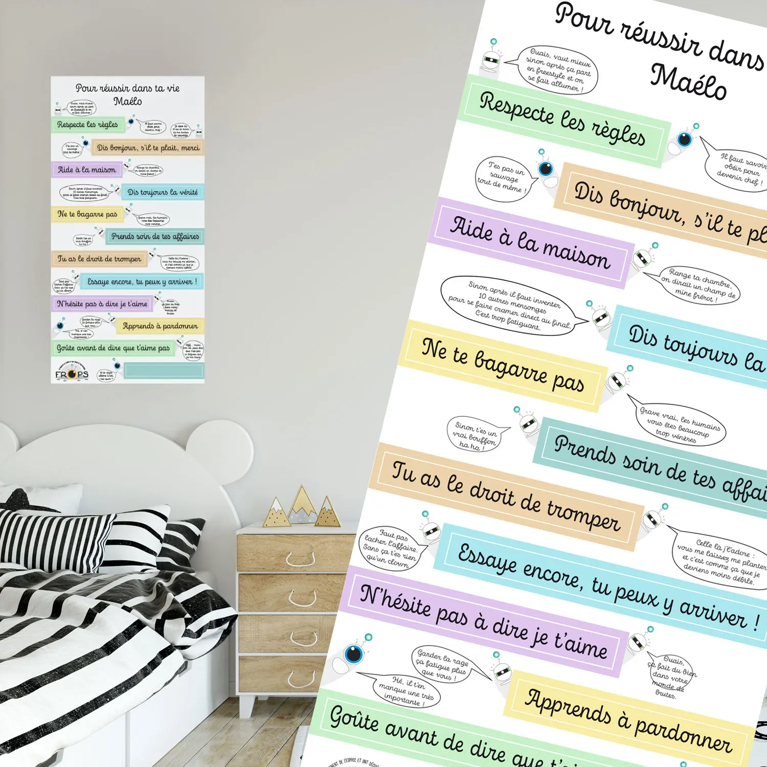 Apprendre à vivre ensemble, à respecter les autres, à persévérer, à dire la vérité, à s’organiser… autant de règles essentielles que l’on répète chaque jour aux enfants. Avec l’affiche FROPS “Pour réussir dans ta vie”, ces grands principes deviennent enfin compréhensibles, accessibles et acceptés, grâce au regard insolent et complice du FROPS rebelle.
