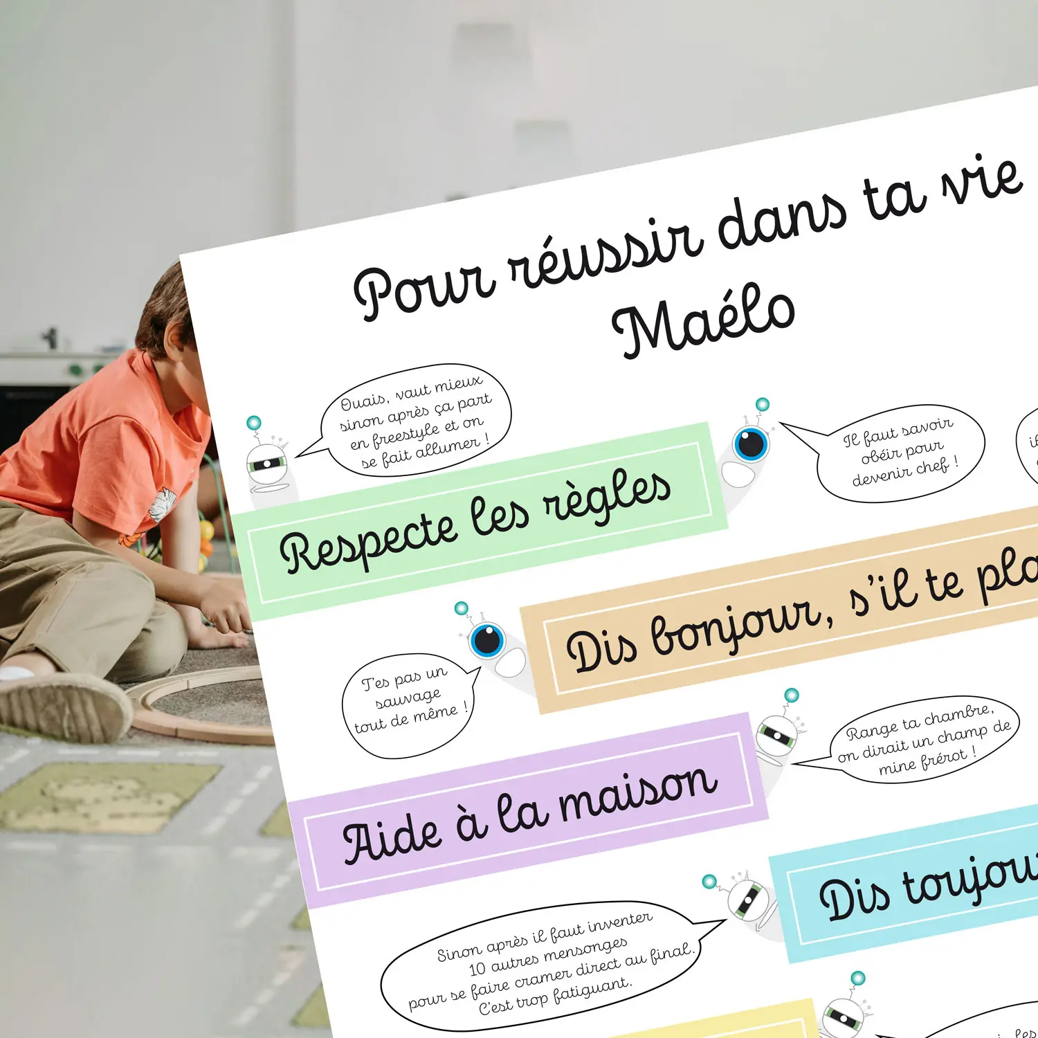 Le prénom de l’enfant peut être intégré sur l’affiche. Cette personnalisation renforce :