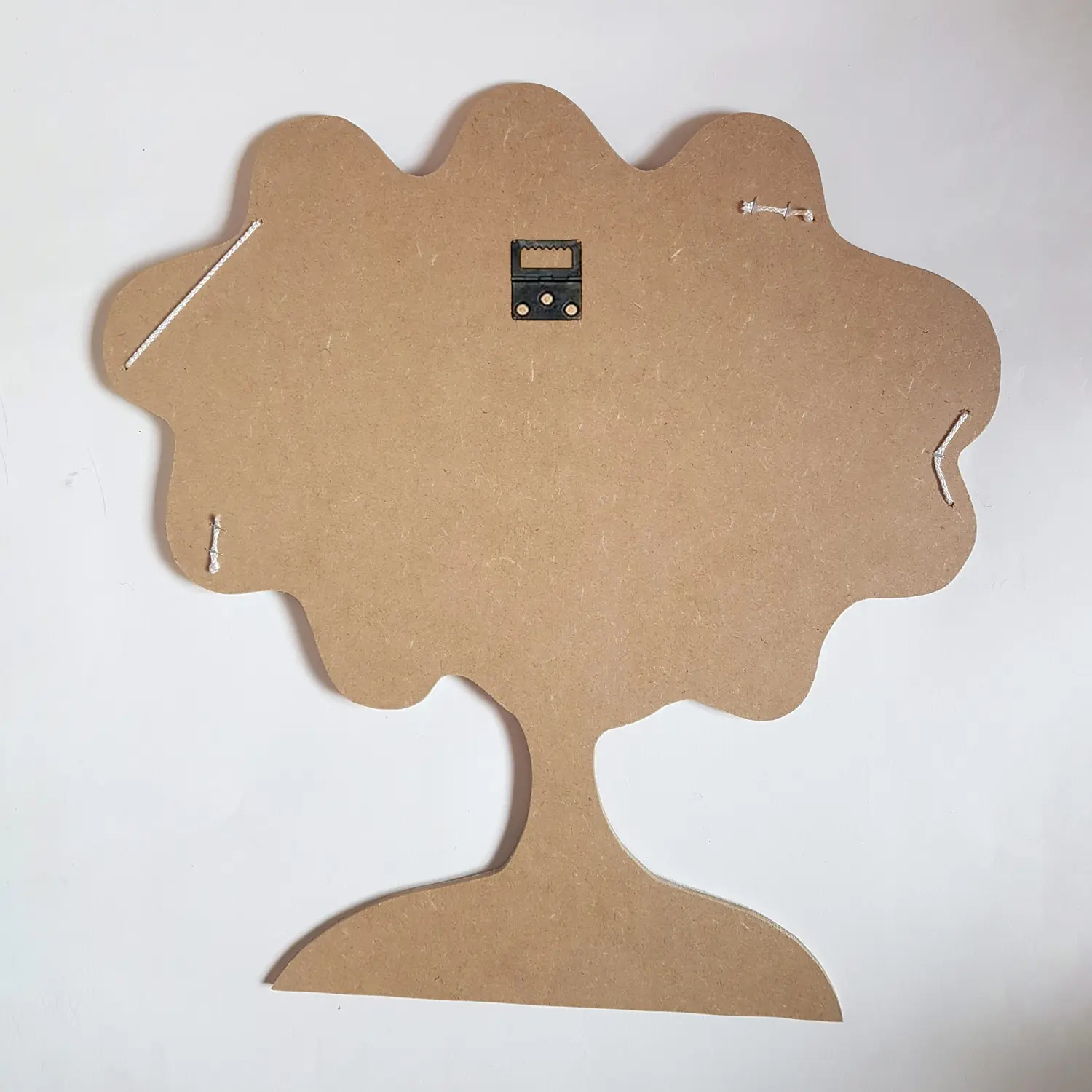 🪚 Une fois que l’ensemble à séché, je le découpe à la scie à chantourner pour lui donner sa forme d’arbre, puis je perce les trous pour faire passer le fil de nylon qui permet de suspendre les 10 mini-pinces blanches fournies.