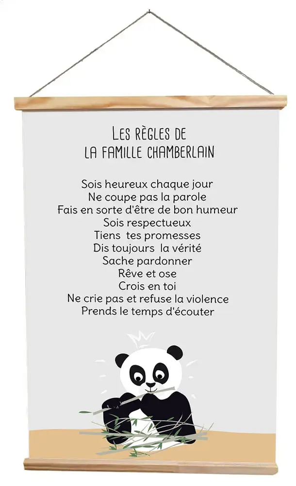Des règles de famille à installer dans la chambre des enfants Cette création vous est proposée sur 3 supports : Téléchargement en formats A4 et A3 à imprimer chez vous Bannière 22,5x43cm : textile mat ignifugé 160g/m2 100% polyester, tissu fluide imprimé en 11 couleurs sans acide ni solvant, pour des couleurs chatoyantes qui ne […]