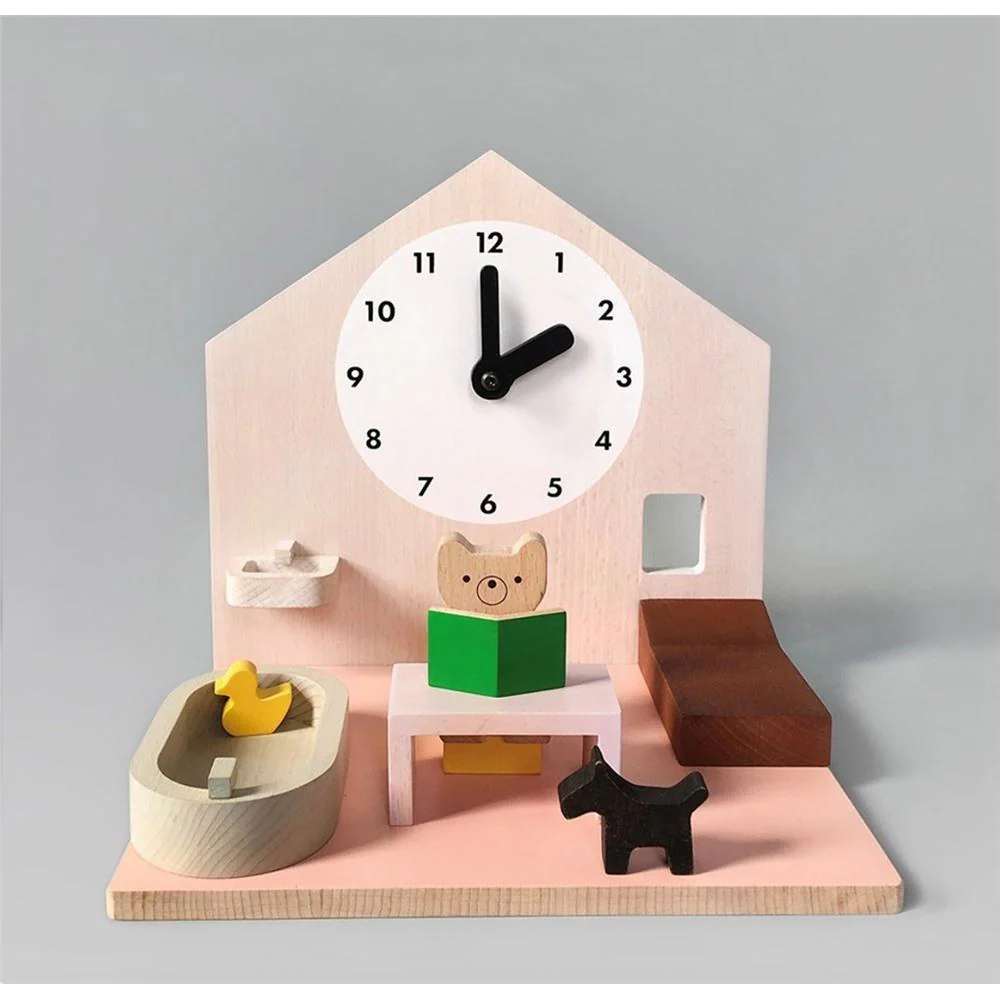 A unique activity dollhouse to help toddlers have fun while learning their routine. Move the clock hands & let’s help the bear follow a daily routine! From waking up to going to sleep, there are lots of things the bear can do in a day. Playing with this sweet toy will surely become part of a child’s daily routine. What’s inside? A bear with a dog lives in a cosy wooden house that has a large wall clock with movable hands, furnished with a bed,bath tub with a yellow duck, wash basin, table, chair, book, tableware & storage bin … plus a routine planner!