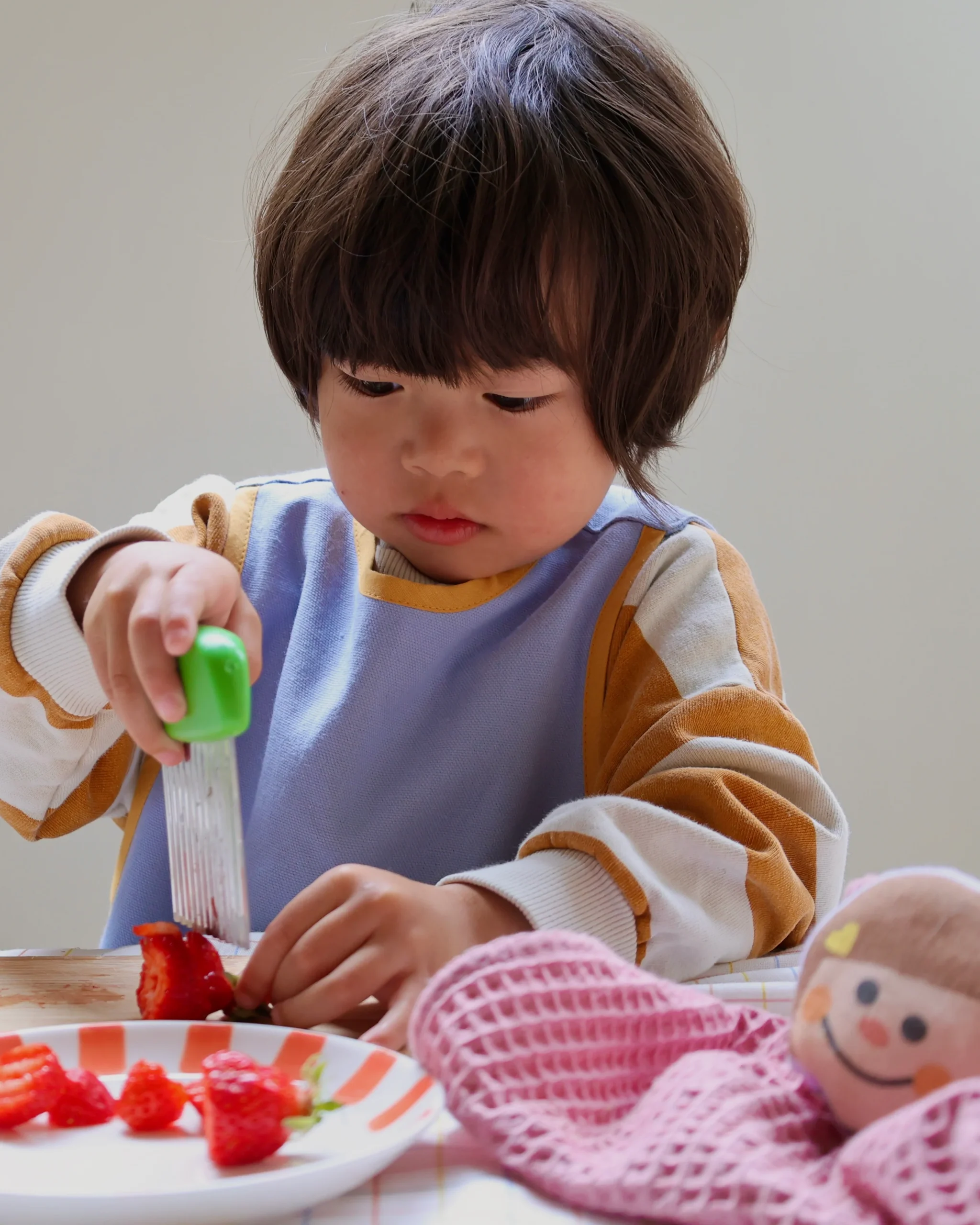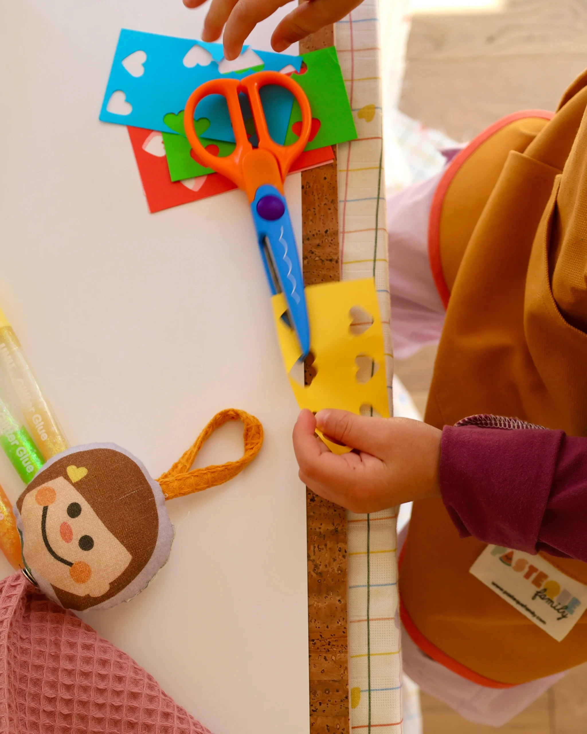 – Coupe innovante équipée de scratches latéraux de couleur contrastante, facilitant la visibilité pour l’enfant qui peut ainsi mettre et enlever le tablier en toute autonomie.