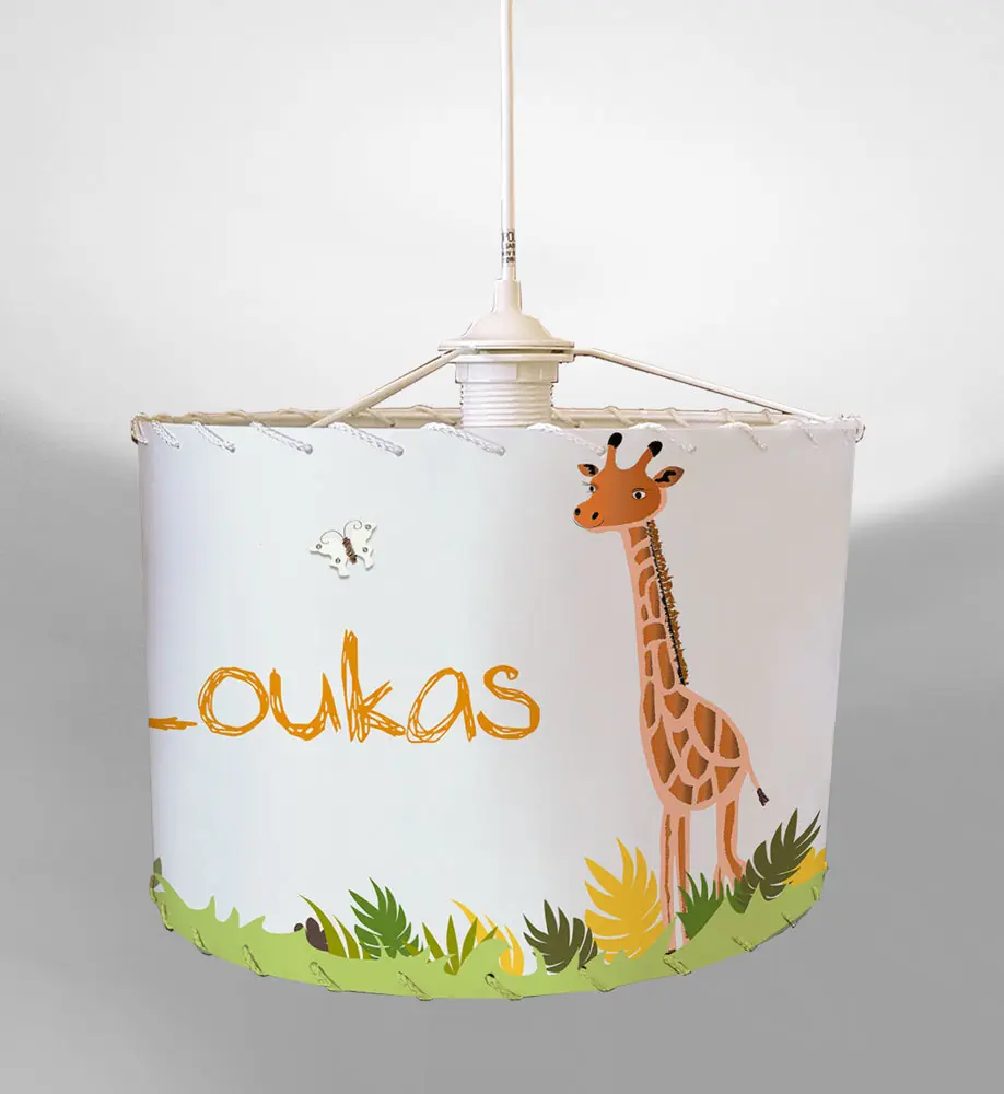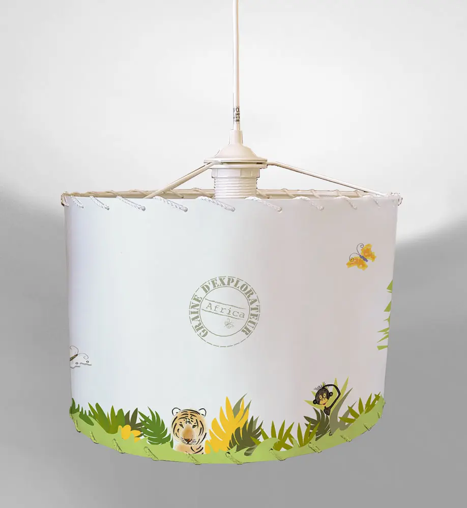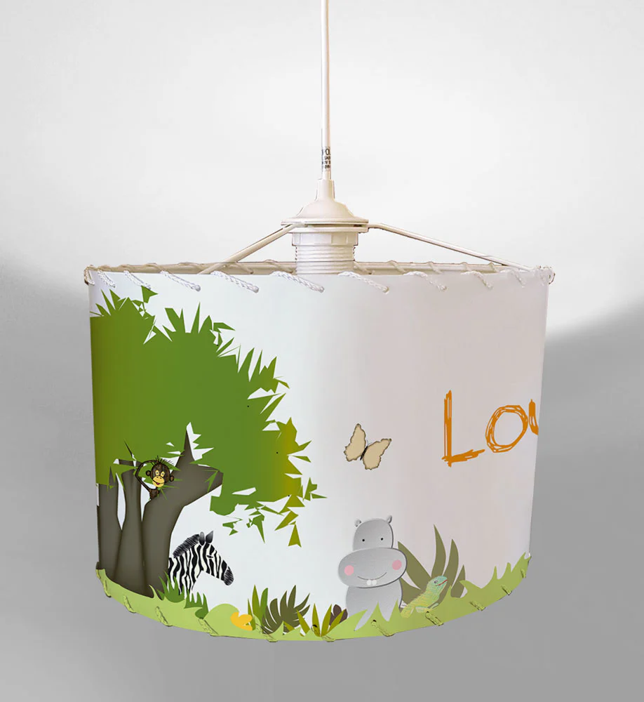Offrez à votre bébé une ambiance chaleureuse et originale avec notre luminaire enfant sur le thème safari. Avec son décor reprenant girafe, éléphant, hippopotame, singes, lion, tigre, iguane, perroquet et zèbre pour une chambre d’enfant savane harmonieuse et pleine de vie.