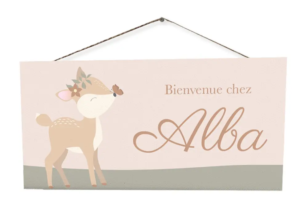 Accueillez votre enfant dans un univers doux et poétique avec cette plaque de porte biche personnalisée.