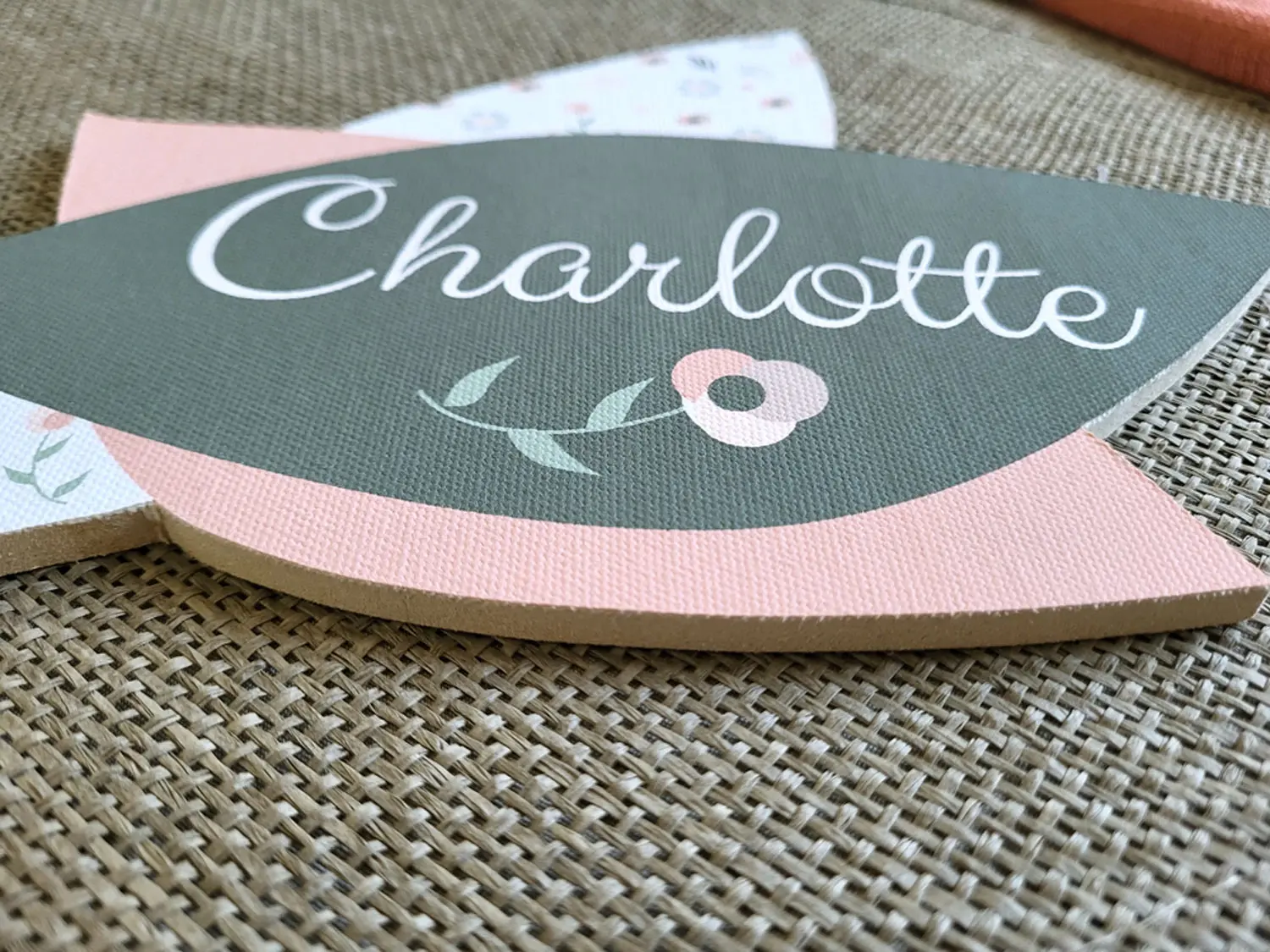 Annoncez l’entrée de la chambre de votre petite fille avec une plaque de porte unique, à la fois élégante et originale. Inspirée de l’univers bohème, elle associe des formes de pétales entremêlés, un jeu de motifs floraux délicats, des teintes terracotta clair et vert forêt et une écriture blanche raffinée du prénom. Une fleur fine vient souligner la personnalisation pour une touche encore plus poétique.