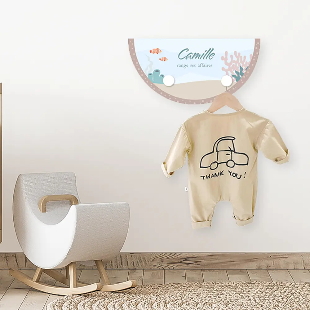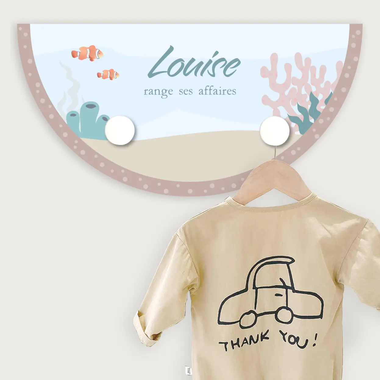 Personnalisé au prénom de votre enfant, le portemanteau 2 patères sous la mer permet une première approche vers l’autonomie : votre petit bout peut ranger lui même ses affaires sur son portemanteau. Que ce soit son manteau, son petit sac ou son doudou, les patères du portemanteau permettent de suspendre facilement les affaires. Voilà une belle idée de décoration utile pour une ambiance sous l’océan !