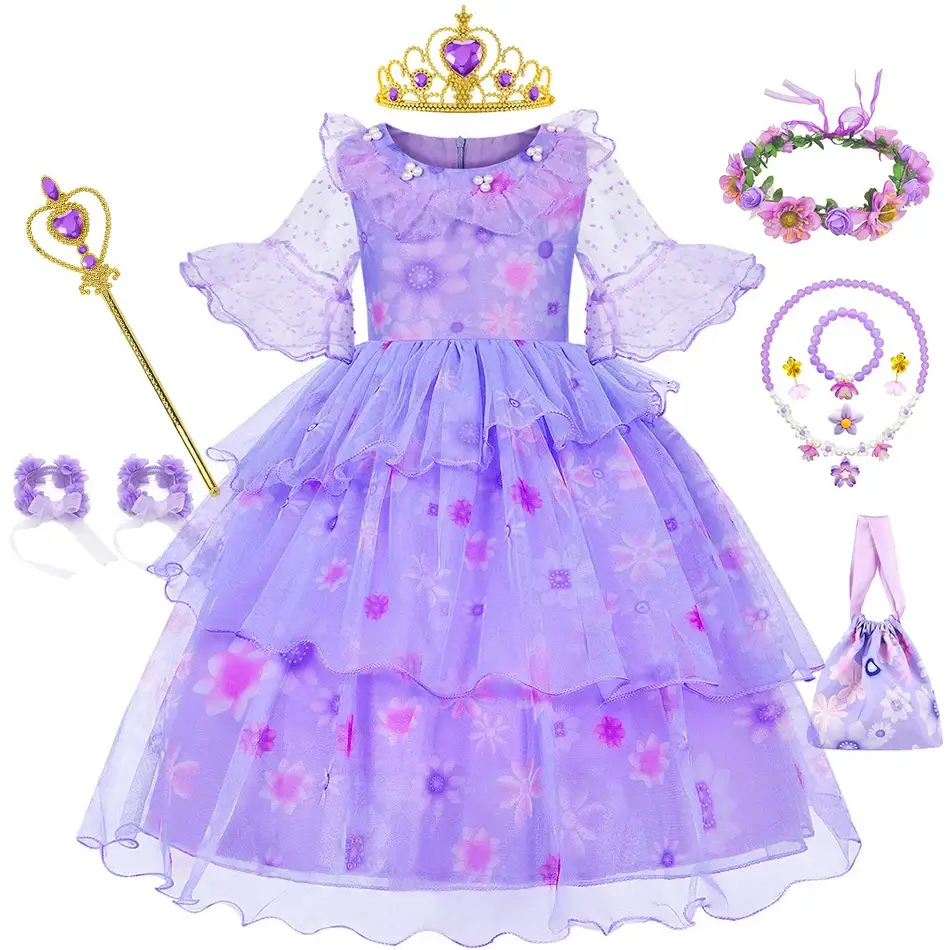 Inspirée du film d’animation Disney « Encanto », cette robe pourpre princesse Isabella est un véritable enchantement pour les petites filles. Confectionnée avec soin dans un mélange doux et confortable de coton et de polyester, cette robe longue jusqu’aux chevilles est ornée de détails floraux délicats, fidèles au style du personnage d’Isabela. Parfaitement adaptée aux enfants de 2 à 6 ans, cette tenue est idéale pour les fêtes d’anniversaire, les soirées costumées ou simplement pour jouer à la princesse au quotidien. Pour compléter le look enchanté, la robe est accompagnée d’accessoires assortis : un collier et un bracelet qui raviront votre petite princesse.