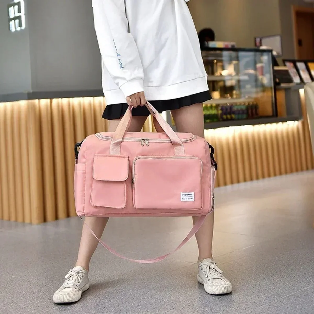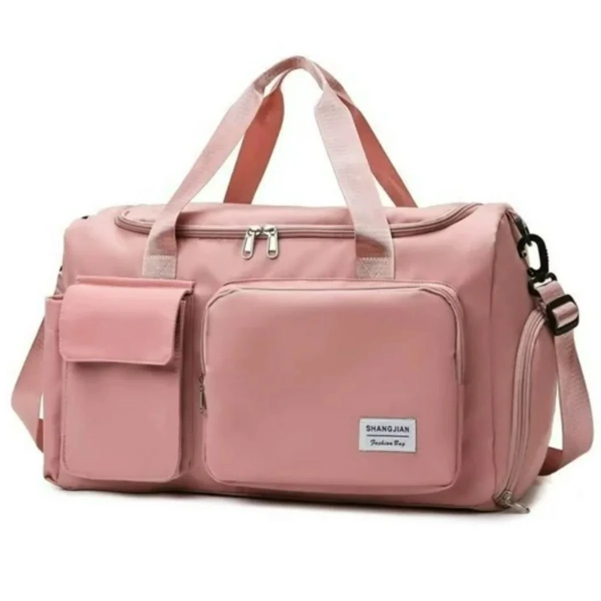 « text »: « Il comprend un grand compartiment central, une poche séparée pour linge sec et humide, un compartiment chaussures isolé, ainsi que des poches avant, arrière et latérales. »